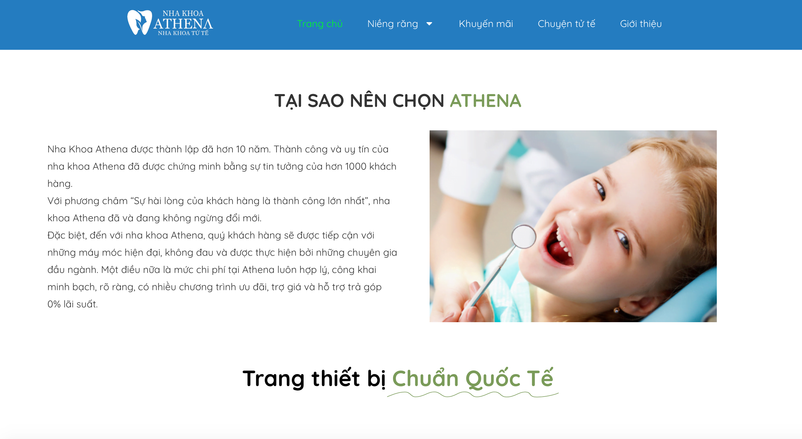 Theo thông tin giới thiệu trên website https://nhakhoaathena.vn, Nha khoa Athena quảng bá là đơn vị có hơn 10 năm hoạt động, nhận được sự tin tưởng của hàng nghìn khách hàng. Cơ sở này cũng giới thiệu sở hữu hệ thống máy móc hiện đại, đội ngũ chuyên gia đầu ngành, chi phí minh bạch và có chính sách hỗ trợ trả góp 0% lãi suất.