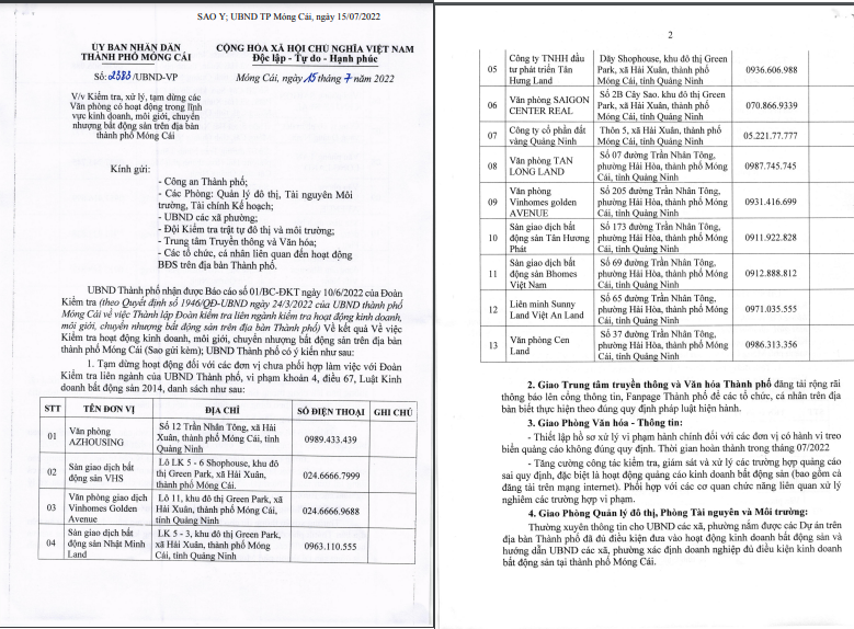 Qua kiểm tra hoạt động kinh doanh, môi giới, chuyển nhượng bất động sản trên địa bàn thành phố, UBND TP. Móng Cái (tỉnh Quảng Ninh) vừa yêu cầu tạm dừng hoạt động đối với 13 văn phòng môi giới bất động sản trên địa bàn.