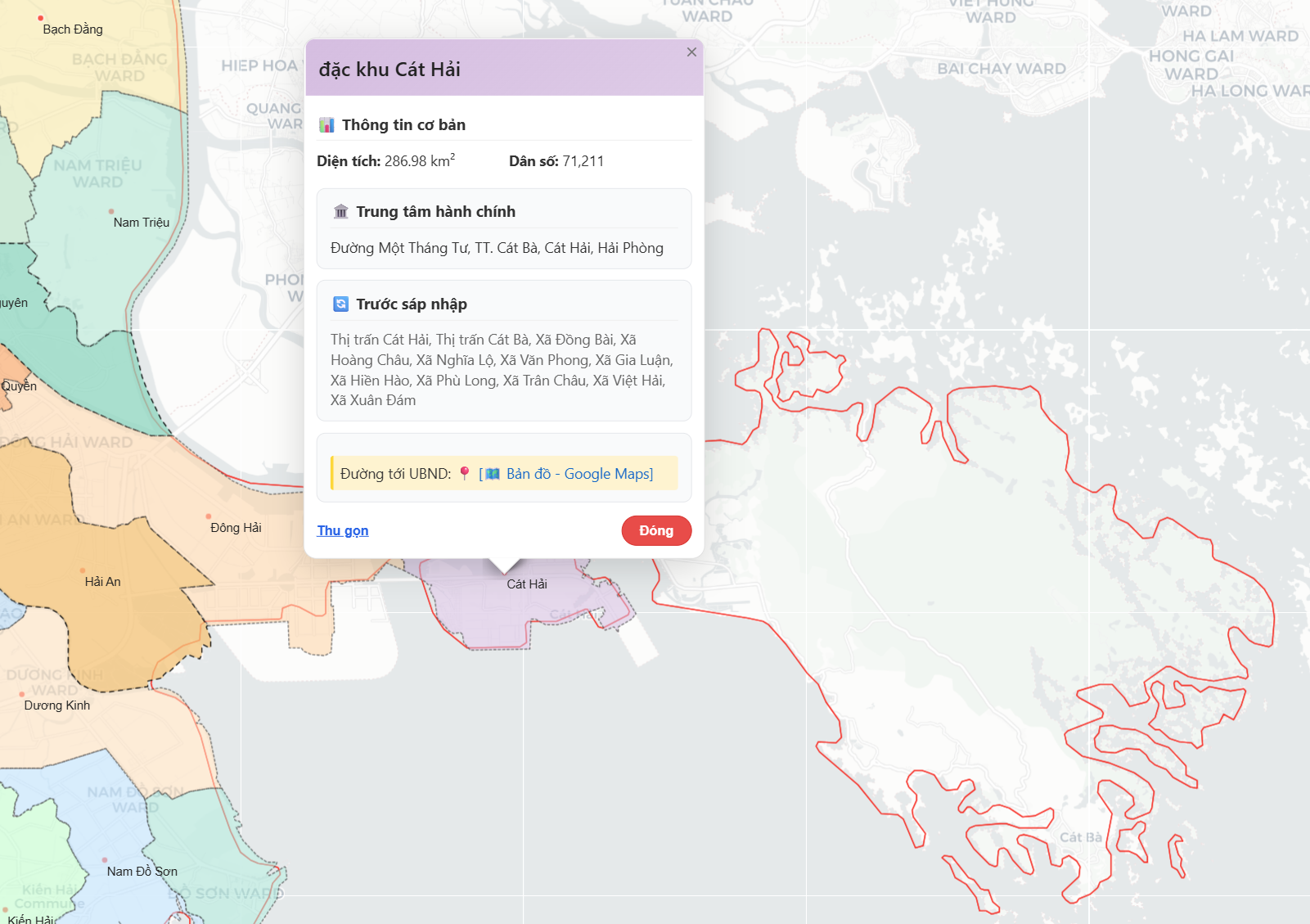 Đặc khu này được hình thành trên cơ sở sắp xếp lại toàn bộ diện tích tự nhiên và quy mô dân số của các đơn vị hành chính cũ gồm: Thị trấn Cát Hải, thị trấn Cát Bà và 10 xã (Đồng Bài, Hoàng Châu, Nghĩa Lộ, Văn Phong, Gia Luận, Hiền Hào, Phù Long, Trân Châu, Việt Hải, Xuân Đám), với quy mô dân số 71.211 người trên diện tích 286,98 km².