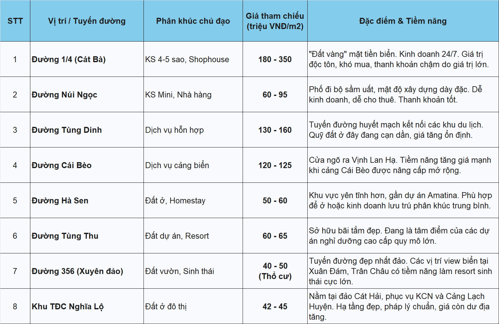 Để giúp nhà đầu tư hình dung rõ nét hơn, dưới đây là chỉ số vị trí cho 8 tuyến đường/khu vực tiêu biểu nhất tại đặc khu Cát Hải.