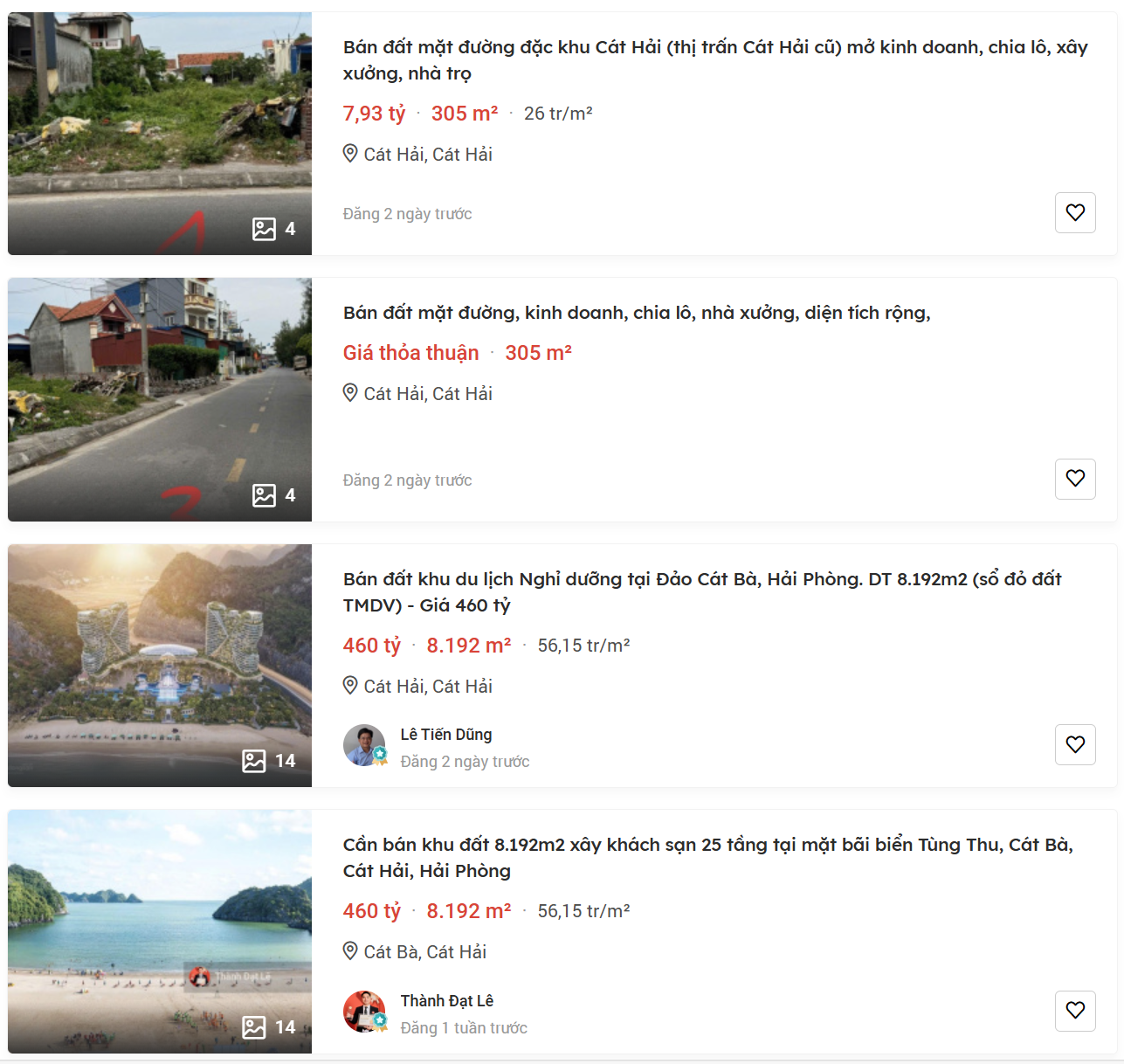 Khu vực Thị trấn Cát Bà (cũ): Quỹ đất cực kỳ khan hiếm, mật độ xây dựng cao. Đây là "trái tim" du lịch, nơi tập trung mọi hoạt động thương mại, dịch vụ sầm uất nhất. Giá thị trường các vị trí mặt tiền đường 1/4 (hướng biển) đang giao dịch ở mức "không tưởng", dao động từ 180 - 350 triệu đồng/m² tùy vị trí và bề rộng mặt tiền. Các lô đất trong ngõ ô tô tại khu vực Núi Ngọc, Tùng Dinh cũng không hề rẻ, dao động từ 60 - 95 triệu đồng/m². Xu hướng các Nhà đầu tư săn lùng các khách sạn mini, nhà phố cũ để cải tạo hoặc xây mới. Tính thanh khoản cao nhưng rào cản gia nhập thị trường lớn do tổng giá trị tài sản khá cao (thường từ 10 tỷ đồng trở lên).
