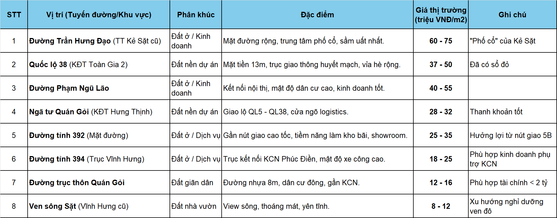 Để cung cấp cái nhìn trực quan, dưới đây là chỉ số giá tại 8 vị trí tiêu biểu đại diện cho các phân khúc khác nhau tại xã Kẻ Sặt.