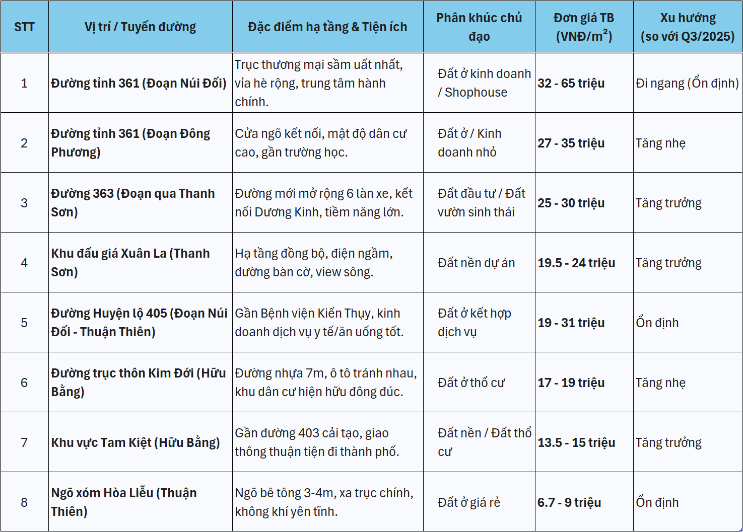 Về xu hướng giá, trong phân khúc cao (mặt đường 361, Núi Đối) giá sẽ đi ngang. Khả năng tăng đột biến là thấp do mức giá nền đã cao. Đối với phân khúc tầm trung (Thanh Sơn, Hữu Bằng), có xu hướng tăng trưởng nhẹ 5 - 8%. Đây là vùng trũng giá thu hút dòng tiền từ các các nhà đầu tư (nội thành Hải Phòng và các vùng lân cận) đang tìm kiếm kênh trú ẩn an toàn và có tiềm năng tăng vốn nhờ hạ tầng (đường 363, 403). Ở phân khúc đất nông nghiệp/đất vườn, giao dịch sẽ trầm lắng do lo ngại về chi phí chuyển đổi mục đích sử dụng đất tăng cao theo bảng giá mới.