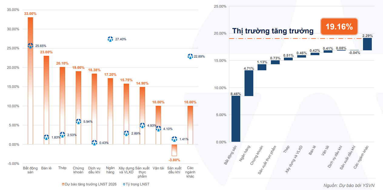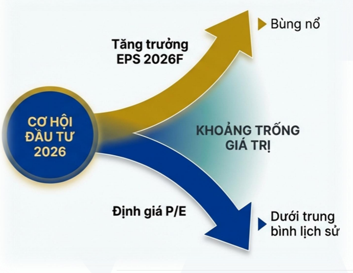 Trên thị trường chứng khoán, Yuanta cho rằng năm 2026 sẽ chứng kiến sự phân kỳ rõ nét giữa triển vọng tăng trưởng lợi nhuận và mặt bằng định giá. Trong khi lợi nhuận sau thuế toàn thị trường được dự báo tăng trưởng khoảng 19% trong năm 2026, định giá P/E của nhiều nhóm ngành vẫn đang thấp hơn trung bình lịch sử, tạo ra “khoảng trống giá trị” đáng kể.