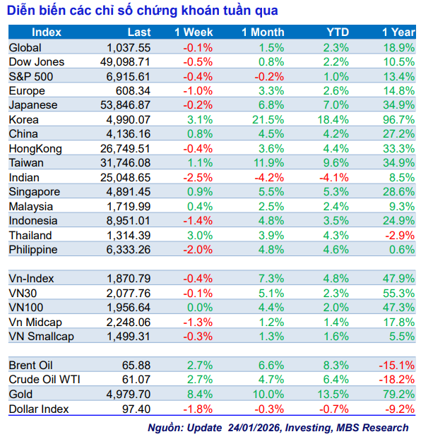 Tuần qua, thị trường chứng khoán toàn cầu chịu áp lực điều chỉnh khi các yếu tố địa chính trị bất ổn quay trở lại. Tại Mỹ, cả ba chỉ số chính đều giảm nhẹ, trong đó Dow Jones giảm 0,5%, S&P 500 giảm 0,4% và Nasdaq giảm 0,1%. Các thị trường châu Âu giảm 1%, ngoài ra các thị trường lớn ở Châu Á cũng giảm điểm như: Nhật Bản -0,2%, Hồng Kông -0,4% và Ấn độ -2,5%. Ngược dòng chứng khoán thế giới gồm: Hàn Quốc +3,1%, Trung Quốc +0,8%.