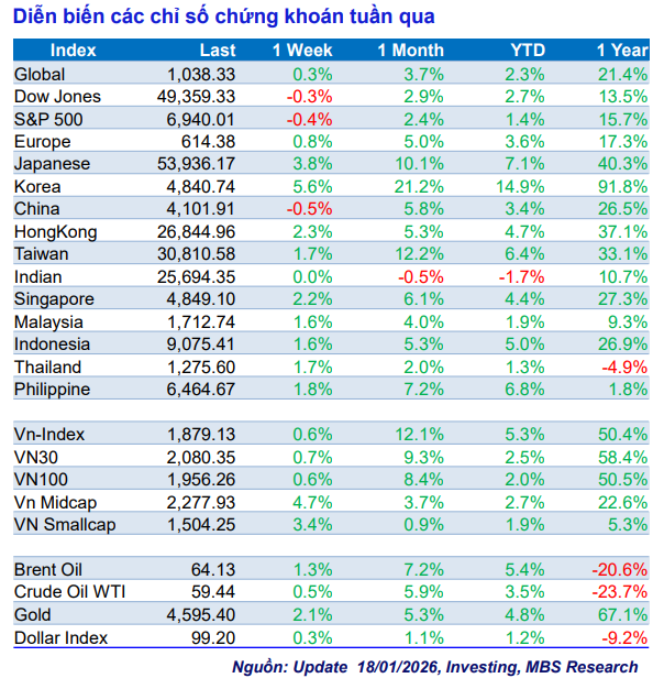 Ngược lại, chứng khoán Mỹ điều chỉnh nhẹ khi nhà đầu tư đối mặt đồng thời với rủi ro địa chính trị và những phát ngôn gây tranh cãi từ Washington. S&P 500, Dow Jones và Nasdaq lần lượt giảm 0,4%, 0,3% và 0,7% trong tuần. Những lo ngại xoay quanh căng thẳng tại Iran, Greenland cũng như sức ép chính trị lên Cục Dự trữ Liên bang Mỹ (Fed) khiến tâm lý thận trọng gia tăng, dù kỳ vọng về chu kỳ nới lỏng tiền tệ trong năm 2026 vẫn chưa thay đổi.