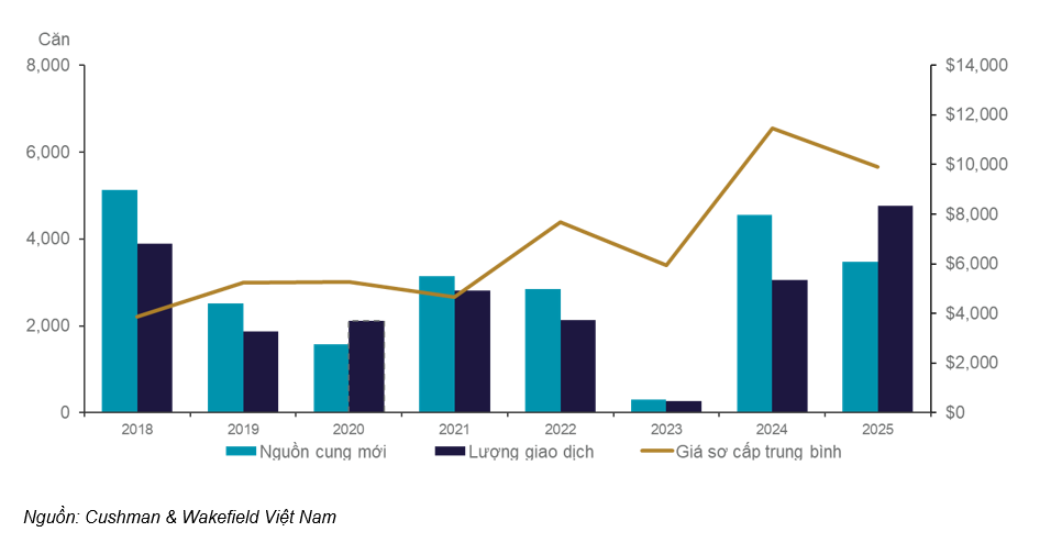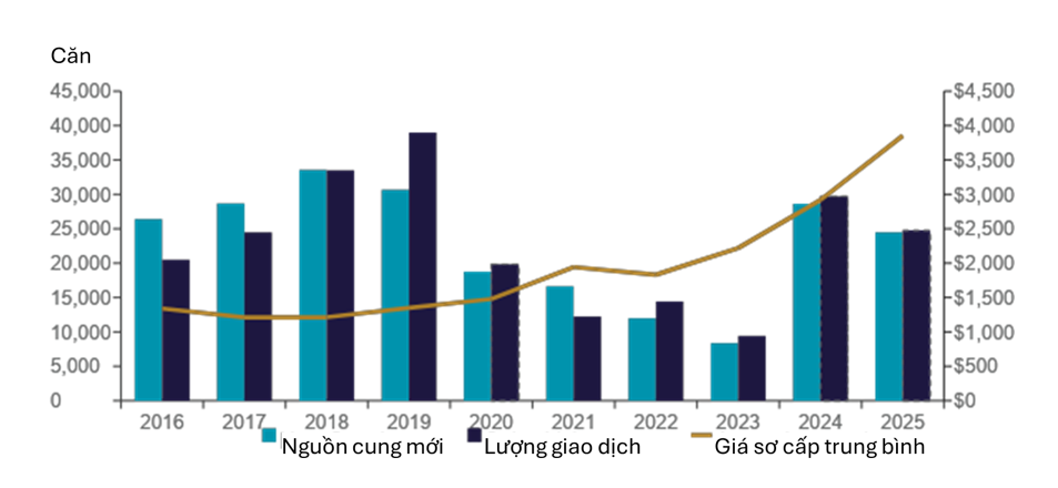 Theo báo cáo nhìn lại 10 năm thị trường nhà ở Hà Nội của Cushman & Wakefield Việt Nam, phân khúc căn hộ đã ghi nhận mức tăng trưởng đáng kể. Tổng nguồn cung trong giai đoạn 2016–2025 tăng 2,9 lần, trong khi giá sơ cấp trung bình tăng 288%, tương đương tốc độ tăng trưởng kép hàng năm (CAGR) khoảng 11%.