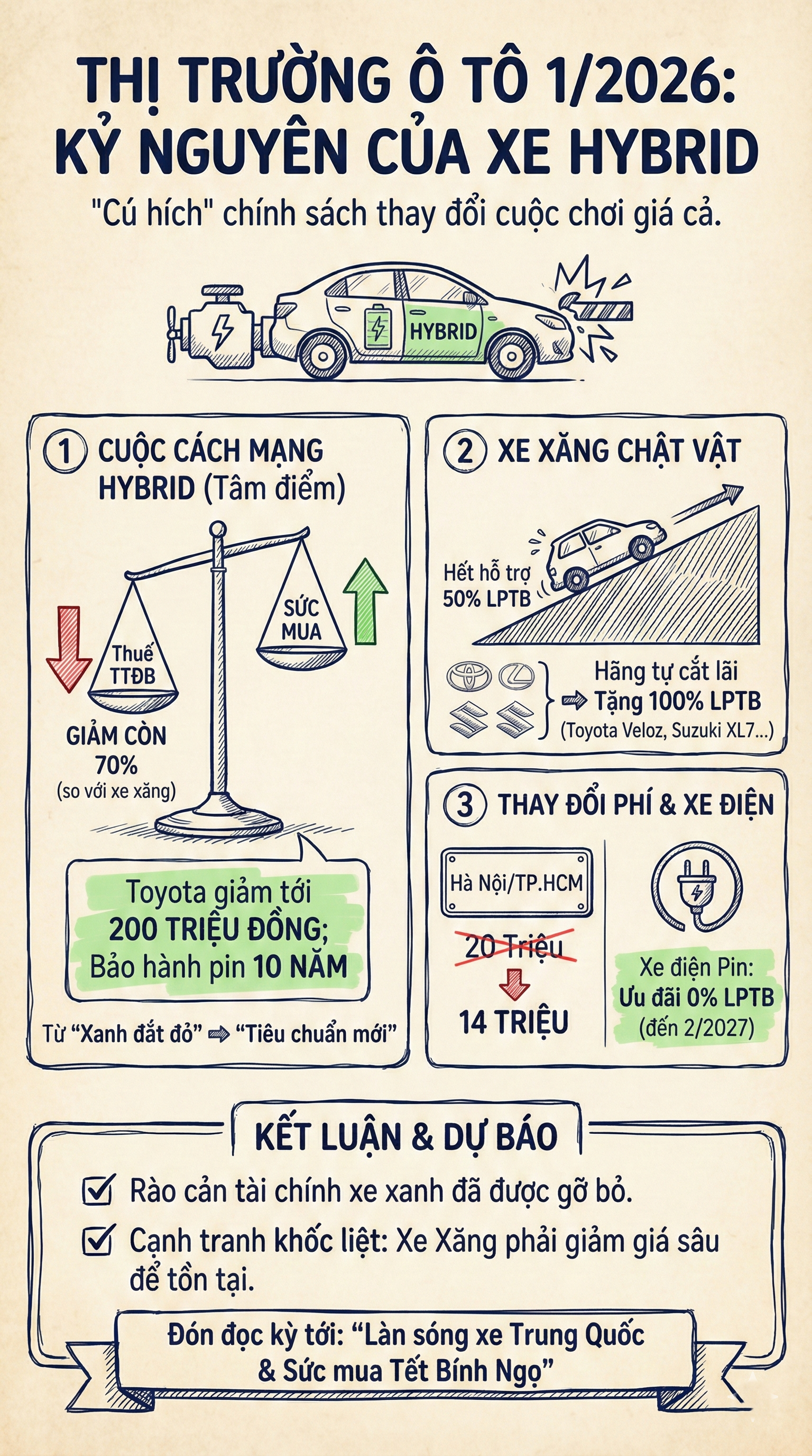 Điểm nhấn quan trọng nhất là sự thay đổi trong hành vi tiêu dùng dưới tác động của "bàn tay vô hình" là chính sách thuế đã ngay lập tức biến dòng xe Hybrid từ một lựa chọn "xanh" đắt đỏ trở thành tiêu chuẩn mới về hiệu quả chi phí, buộc các ông lớn như Toyota và Honda phải tái cấu trúc toàn bộ chiến lược định giá. Song song đó, sự thống trị tuyệt đối của VinFast với doanh số vượt tổng ba đối thủ bám đuổi cộng lại đã khẳng định vị thế không thể đảo ngược của xe điện trong tâm trí người tiêu dùng Việt.