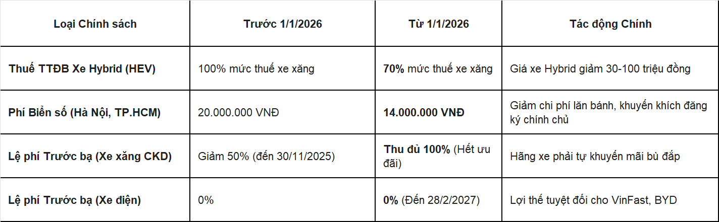 Trong khi xe Hybrid và xe điện được ưu ái, xe xăng truyền thống lại rơi vào thế khó. Chính sách hỗ trợ 50% lệ phí trước bạ (LPTB) của Chính phủ dành cho xe lắp ráp trong nước đã kết thúc vào tháng 11/2025, tạo ra một "khoảng trống chính sách" trong tháng 1/2026.