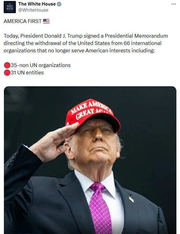 Kênh truyền hình TRT World đưa tin, trong thông báo trên mạng xã hội X, Nhà Trắng nói rõ: "Hôm nay, Tổng thống Donald J. Trump đã ký một bản ghi nhớ chỉ đạo việc Mỹ rút khỏi 66 tổ chức quốc tế không còn phục vụ lợi ích của chúng ta, bao gồm: 35 tổ chức không thuộc LHQ và 31 thực thể thuộc LHQ".