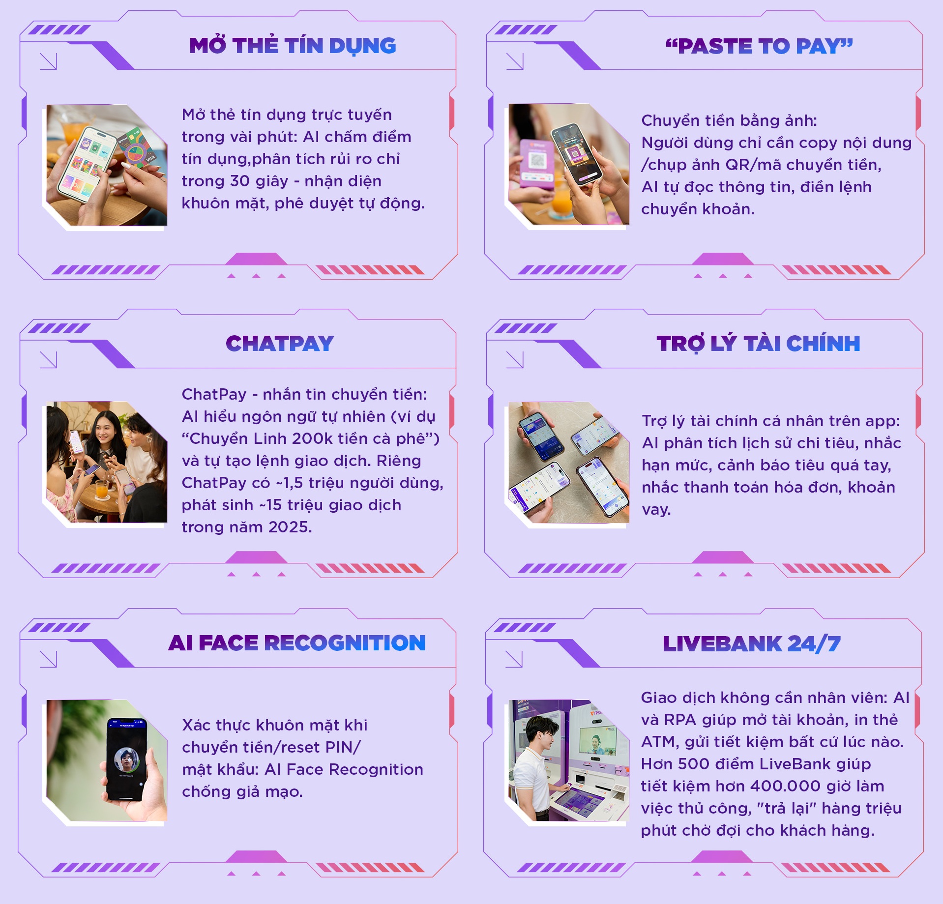 Khác biệt tiếp theo nằm ở định vị khách hàng trọng tâm. TPBank lựa chọn nhóm khách hàng trẻ - những người xem tốc độ xử lý, trải nghiệm số liền mạch và cá nhân hóa là tiêu chuẩn mặc định. Từ định vị này, sản phẩm ứng dụng AI được thiết kế xoay quanh yêu cầu “nhanh - gọn - trực quan”, từ mở thẻ trực tuyến, chuyển tiền bằng ảnh đến LiveBank 24/7. Công nghệ, vì thế, không đi sau nhu cầu thị trường mà được đặt vào đúng nhịp sống số của nhóm người dùng chủ lực.