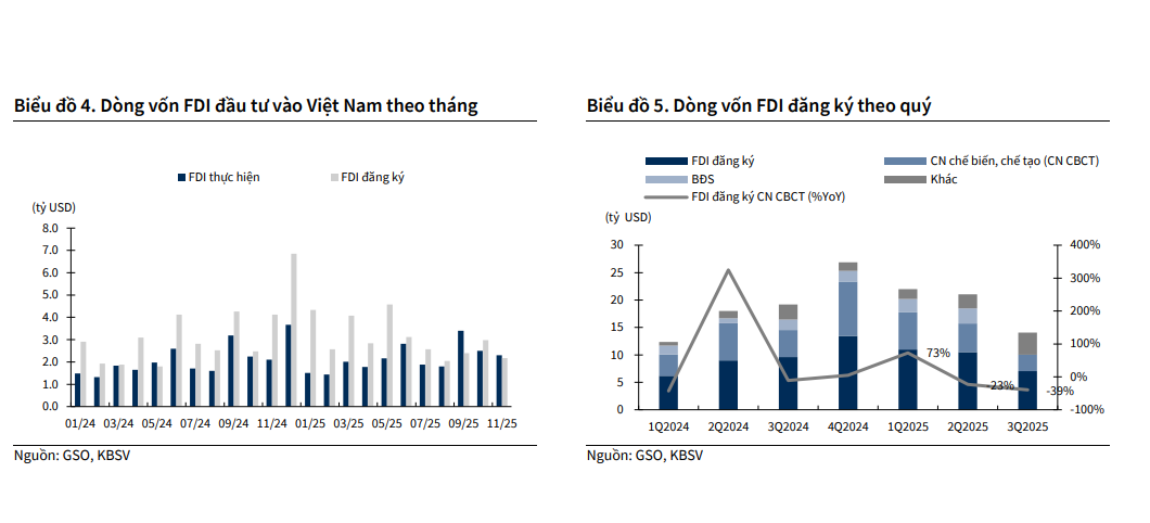 Mức tăng trưởng theo quý khá ổn định, dao động trong khoảng 7 - 8% mỗi năm. Đây chủ yếu là kết quả từ các dự án đã đăng ký từ giai đoạn trước khi xảy ra cuộc chiến thương mại mới. Tuy nhiên, ở chiều ngược lại, dòng vốn FDI đăng ký mới lại đang cho thấy dấu hiệu sụt giảm rõ rệt, đặc biệt là trong lĩnh vực công nghiệp chế biến chế tạo, ngành vốn được xem là động lực chính thu hút FDI vào Việt Nam.