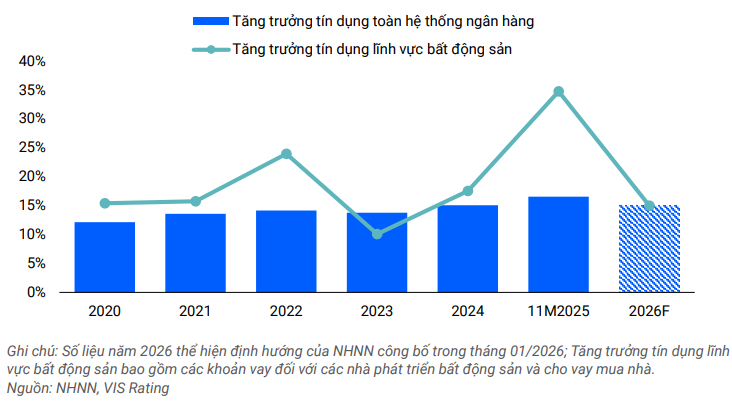 Đối với ngành tài chính, bức tranh tín nhiệm năm 2026 theo VIS Rating dự kiến phân hóa. Tăng trưởng tín dụng toàn hệ thống chậm lại - mục tiêu năm 2026 là 15%, so với thực hiện 19% trong năm 2025 - cùng với việc kiểm soát tín dụng chảy vào các dự án bất động sản rủi ro cao sẽ giúp giảm áp lực thanh khoản và hạn chế rủi ro tăng trưởng nóng trong ngắn hạn.