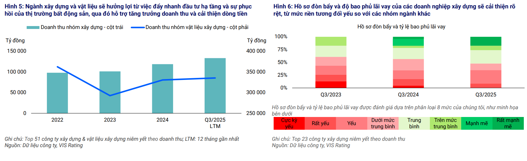 Ngành xây dựng và vật liệu xây dựng là những ngành được hưởng lợi đáng kể từ việc đẩy mạnh đầu tư hạ tầng và sự phục hồi của thị trường bất động sản, với doanh thu dự kiến tăng 15–20%. Nhờ đó, hồ sơ tín nhiệm của các doanh nghiệp trong ngành này được cải thiện rõ rệt, từ mức tương đối thấp trong giai đoạn trước.