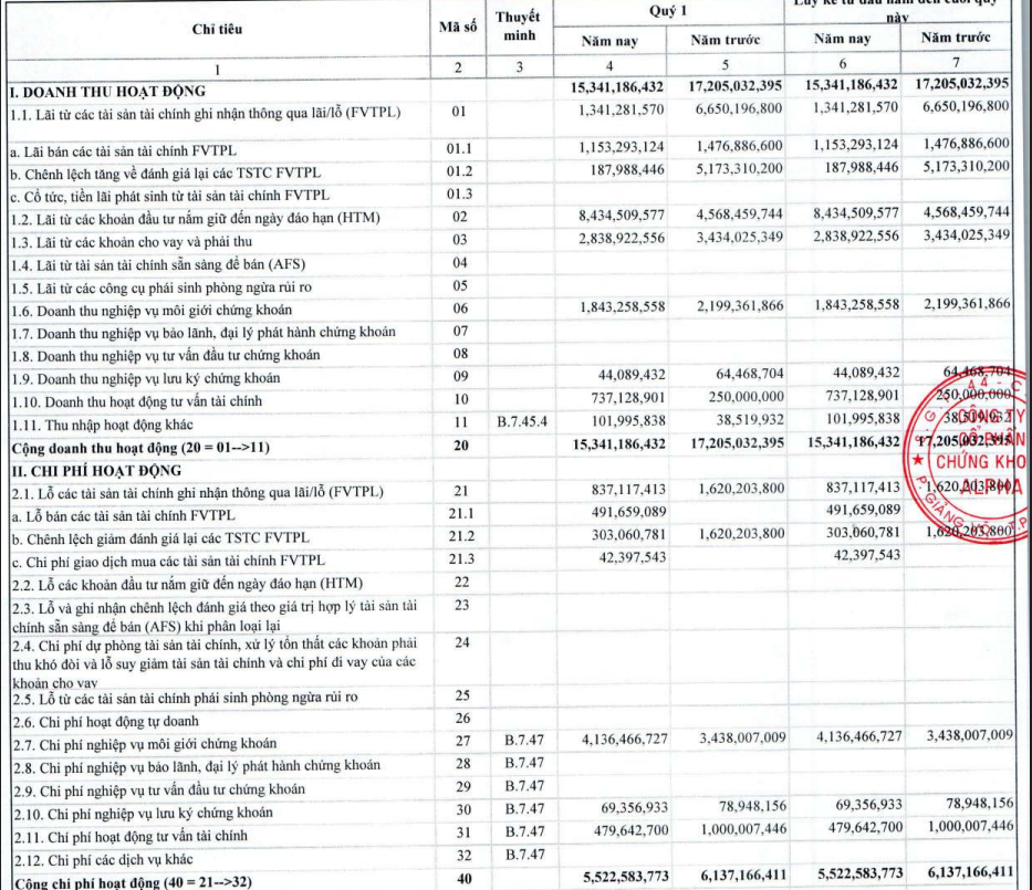 Ở chiều ngược lại, nguồn thu từ các khoản đầu tư nắm giữ đến ngày đáo hạn (HTM) tăng trưởng mạnh, đạt 8,43 tỷ đồng, tăng 85% và trở thành trụ cột chính đóng góp doanh thu. Bên cạnh đó, lãi từ cho vay và phải thu đạt 2,84 tỷ đồng, trong khi doanh thu môi giới chứng khoán giảm xuống 1,84 tỷ đồng (giảm 16%), phản ánh sự suy yếu của hoạt động môi giới trong bối cảnh thị trường biến động.