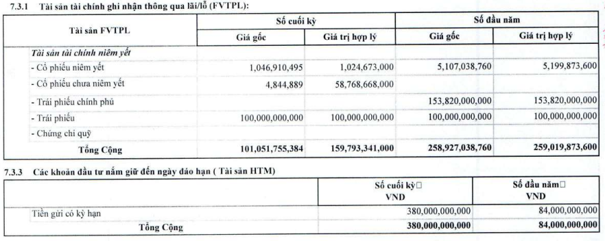 Ngược lại, các khoản đầu tư nắm giữ đến ngày đáo hạn (HTM) tăng vọt từ 84 tỷ đồng lên 380 tỷ đồng, tức tăng thêm gần 296 tỷ đồng, trở thành khoản mục chiếm tỷ trọng lớn nhất trong danh mục tài sản tài chính. Điều này phản ánh xu hướng chuyển sang kênh đầu tư an toàn, có thu nhập ổn định như tiền gửi kỳ hạn.