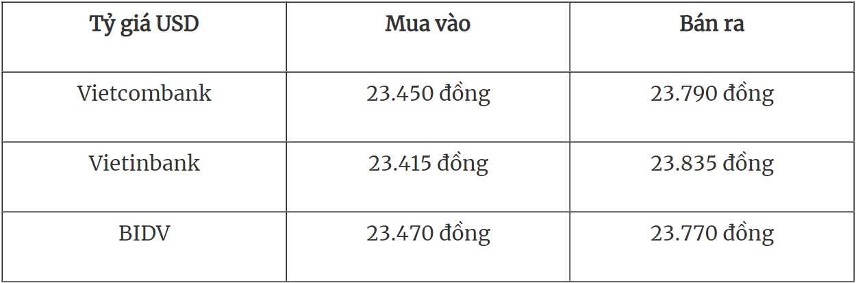 Tỷ giá USD tại các ngân hàng thương mại mua vào và bán ra như sau: