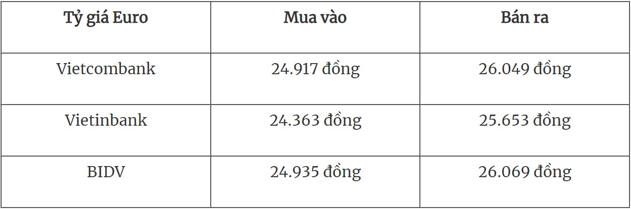 Tỷ giá Euro tại các ngân hàng thương mại mua vào và bán ra như sau: