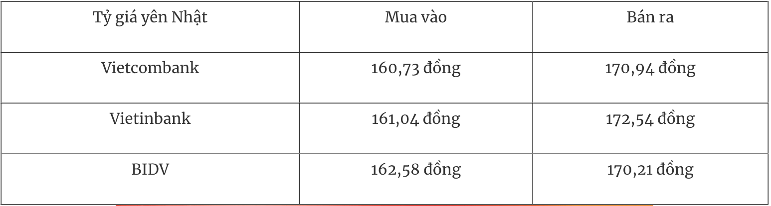 Tỷ giá yên Nhật tại một sô ngân hàng thương mại mua vào và bán ra như sau: