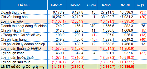 Lũy kế cả năm, doanh thu thuần giảm 31% còn hơn 27,900 tỷ đồng, lỗ ròng lên tới 12,966 tỷ đồng, cao hơn đáng kể so với năm 2020.