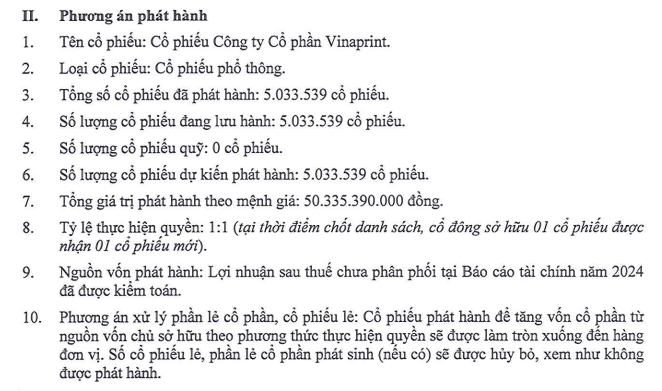 Theo công bố mới nhất, VinaPrint ấn định ngày 23/01/2026 là ngày giao dịch không hưởng quyền để thực hiện chia thưởng cổ phiếu từ nguồn lợi nhuận sau thuế chưa phân phối theo báo cáo tài chính năm 2024 đã được kiểm toán. Doanh nghiệp dự kiến phát hành hơn 5,03 triệu cổ phiếu thưởng theo tỷ lệ 1:1, tức cổ đông sở hữu 1 cổ phiếu sẽ nhận thêm 1 cổ phiếu mới.