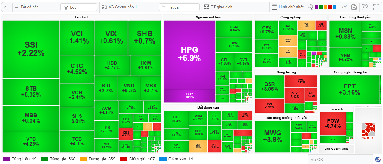 Bên cạnh đó, nhóm cổ phiếu thuộc hệ sinh thái Vingroup giao dịch tích cực. VIC tăng mạnh lên khoảng 152.900 đồng/cổ phiếu, VHM tăng lên 92.900 đồng/cổ phiếu, trong khi VRE cũng duy trì sắc xanh nhẹ. Sự bứt phá của các mã vốn hóa lớn này góp phần kéo chỉ số VN-Index tiến sát mốc 1.700 điểm.