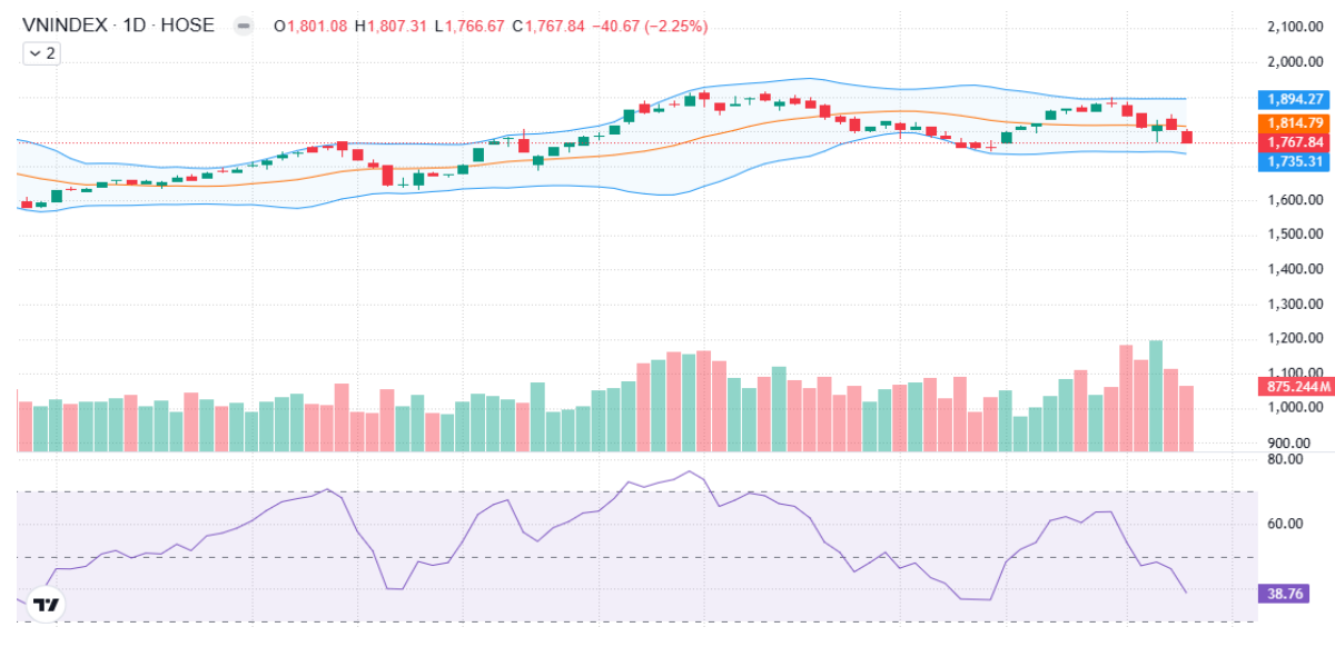 Trên khung đồ thị giờ, VN-Index tiếp tục kiểm định đường biên dưới của dải Bollinger Band, trong khi chỉ báo RSI đang tiến dần về vùng quá bán. Điều này cho thấy khả năng thị trường có thể xuất hiện những nhịp hồi kỹ thuật xen kẽ trong quá trình điều chỉnh.