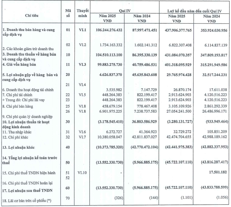Sau khi khấu trừ chi phí khác, lợi nhuận sau thuế thu nhập doanh nghiệp quý 4/2025 âm 13,55 tỷ đồng, cao hơn mức lỗ gần 6 tỷ đồng của quý 4/2024.