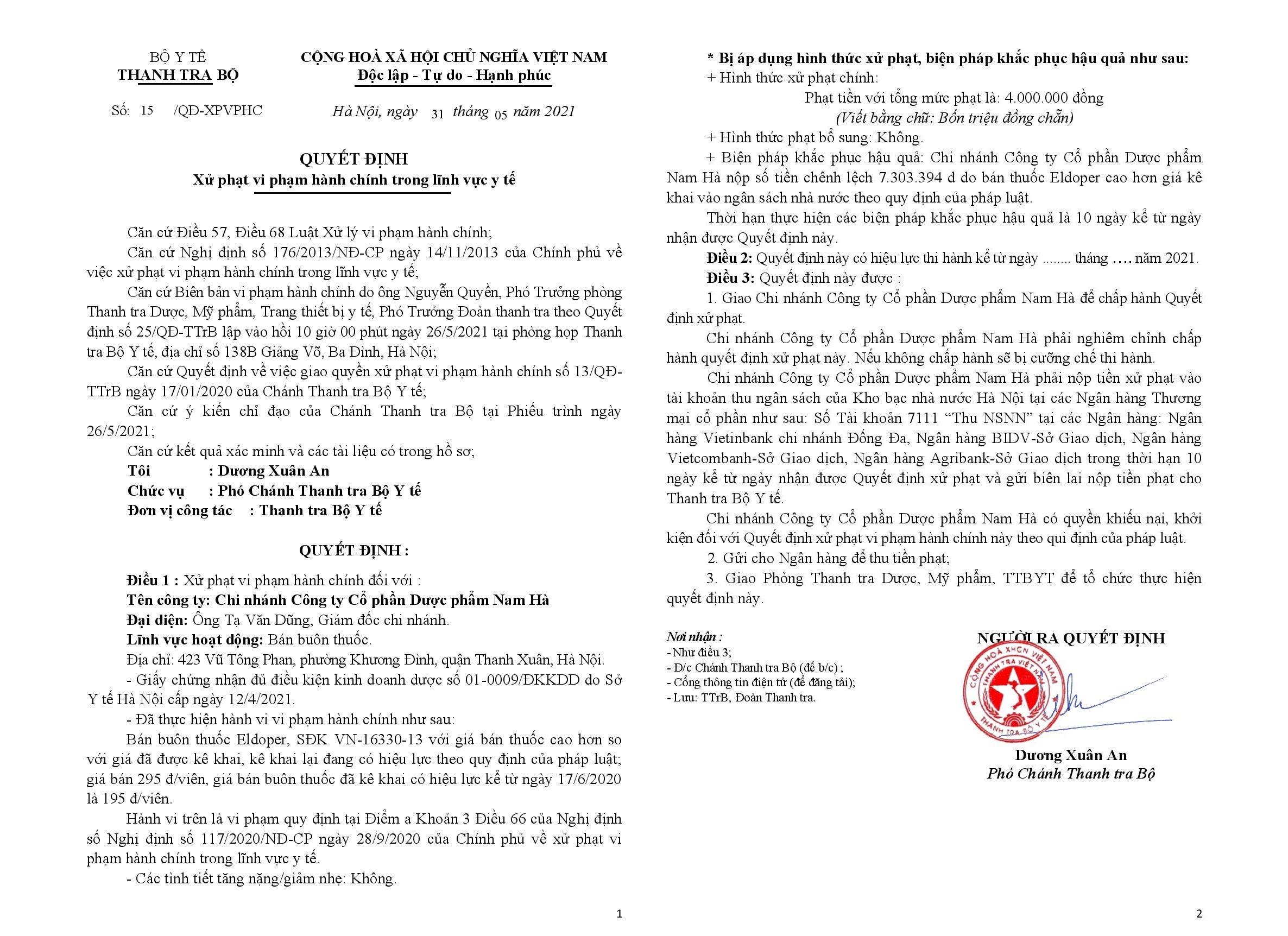 Quyết định nêu rõ, lý do xử phạt là vì Chi nhánh Công ty CP Dược phẩm Nam Hà có địa chỉ trên đã thực hiện hành vi bán buôn thuốc Eldoper (số đăng ký VN-16330-13) với giá bán thuốc cao hơn so với giá đã được kê khai, kê khai lại đang có hiệu lực theo quy định của pháp luật.